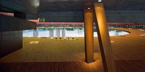Ebenso untypisch ist bereits der Standort des Neubaus mitten in der Stadt. Weil durch große Ansammlungen von Menschen Probleme entstehen können, wählt man für Sportstätten städtische Randlagen oder erschließt außerstädtische Bereiche. Dort entstehen dann meist spektakuläre Architekturmarken, deren Sinnhaftigkeit nur wenig mehr als neunzig Minuten dauert und die danach wieder zu abgeschirmten, stark gesicherten Festungen geschlossen werden.