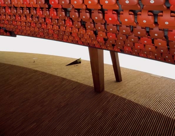 „Ein Stadion muss auch dann gut aussehen, wenn es nicht voll ist“, sagt Eraldo Consolascio. Das Rot der Sitze, das Rostbraun von Cortenstahl, die Dachuntersicht aus Robinienholz und die extensiv begrünte Dachfläche, in die auch noch Solarpaneele mit einer Gesamtfläche von 2500 Quadratmetern aufnimmt, sorgen für ein angenehmes, Harmonie ausstrahlendes Flair und machen die Anlage zu einem Ort, der auch dann Stimmung vermittelt, wenn er unbespielt ist.