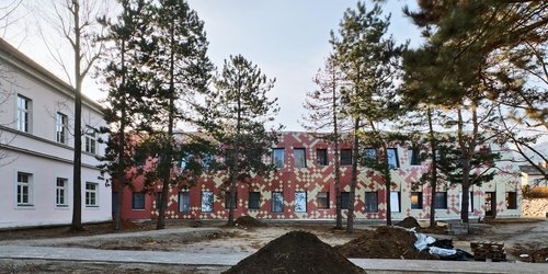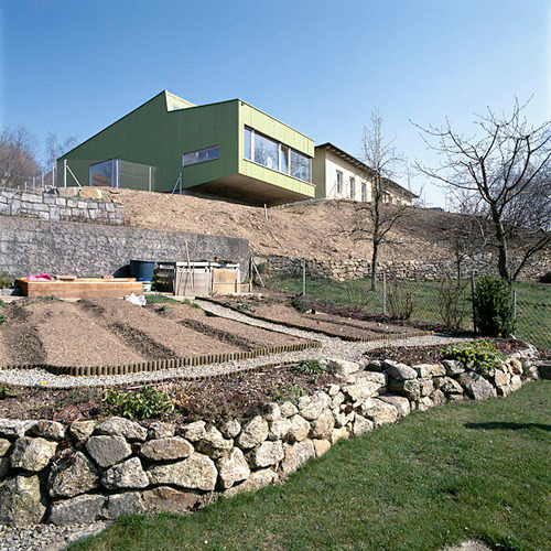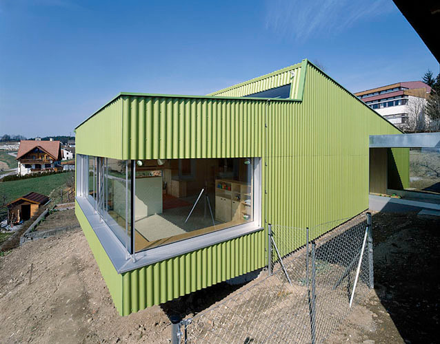 Planungsbeginn im Mai, Baubeginn zwei Monate später, Fertigstellung im Oktober und ein Budget von 180.000 Euro: Diese Schlagworte allein beschreiben eine beachtliche Leistung. Die Erweiterung des bestehenden Kindergartens in Neumarkt im Mühlkreis ist jedoch mehr als das bloße Meistern ungünstiger Voraussetzungen. Die im Ort ansässigen Architekten Peter Schneider und Erich Lengauer haben ein ungewöhnliches, ja sinnliches Objekt geschaffen. Mit seiner lang gestreckten, in einem großen Panoramafenster mündenden Form, dem breiten Oberlicht und der grünen Fassade sieht der Kindergartenzubau aus wie ein Krokodil. Da waren sich von Beginn an alle sicher: Kinder, PädagogInnen ebenso wie die NachbarInnen.