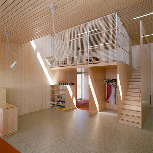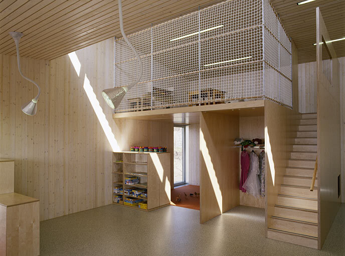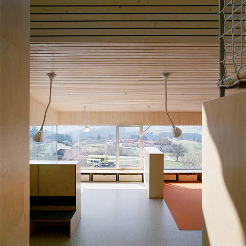 Das Budget, mit dem die Architekten den Zubau zu realisieren hatten, betrug weniger als die Hälfte der für ähnliche Aufgaben üblicherweise bewilligten Mittel. Aber auch der Bauplatz sowie Lage und Ausformung des Bestands stellten massive Einschränkungen für das Projekt dar. Auf das Wesentliche der Aufgabe konzentriert, schufen Schneider & Lengauer trotzdem einen großzügigen, den pädagogischen Richtlinien entsprechenden Gruppenraum, der den Kindergarten um mehr als nur die gewonnenen Flächen bereichert. Für den Baustoff Holz sprachen nicht nur seine besondere Eignung zur Vorfertigung und die damit verbundene Bauzeitverkürzung, sondern auch seine optischen, akustischen und haptischen Qualitäten, die Schneider & Lengauer einsetzten, um die Architektur mit Begriffen wie Naturverbundenheit, Wärme und Geborgenheit zu verknüpfen.