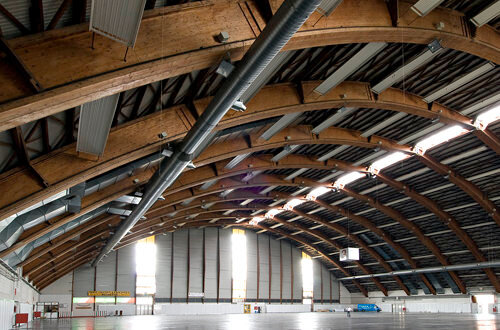 Aber zurück zu Profanem: Um es gleich vorwegzunehmen – die Holzkonstruktion ist, soweit das Auge eine kritische Sicht erlaubt, in gutem Zustand. Im Innenbereich gibt es kaum größere, sonst oft durch Sonneneinstrahlung oder Heizung ausgelöste Schwindrisse. Die Oberflächen der außen liegenden Teile der Träger (Auflagerbereiche) sind stark nachgedunkelt, könnten aber durch Abschleifen und neuen Anstrich aufgehellt werden. Der Wartungsaufwand in diesen 40 Jahren galt also kaum der Holzkonstruktion, hingegen wurde vor zehn Jahren die alte Welleterniteindeckung durch Alu-Trapezbleche ersetzt.