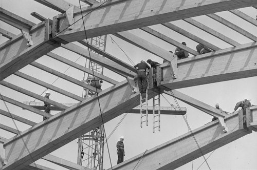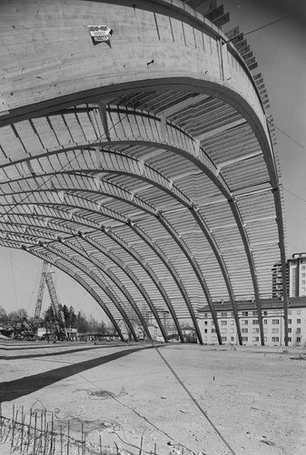 Das Herausragende an den technischen Lösungen von damals ist wohl das Konzept der zweiteiligen Binderquerschnitte mit aufgeleimten Gurten aus mehrlagig verleimten Platten. Die Querschnittshöhe ist dem Momentenverlauf angepasst, also veränderlich, was im Zuschnitt vor dem Gurtaufleimen höchste Genauigkeit erfordert. Besonders durchdacht und raffiniert gelöst sind die verleimten, deshalb starren Montagestöße: seitlich aufgeleimte Platten an den Stegen und über schräge Keilzinkung mit zusätzlicher Keilwirkung verleimt gestoßene Flansche. Die Halbbinder wurden noch im Werk in je drei Teile getrennt, in Folie verpackt, mit der Bahn antransportiert, in einer adaptierten, beheizten kleinen Messehalle wieder zusammengeleimt, ausgehärtet, vorgelagert und montiert.