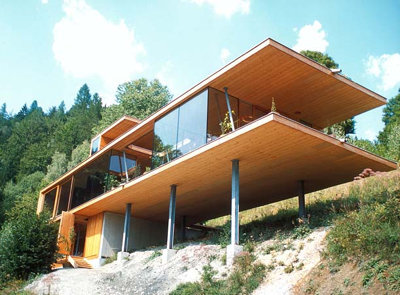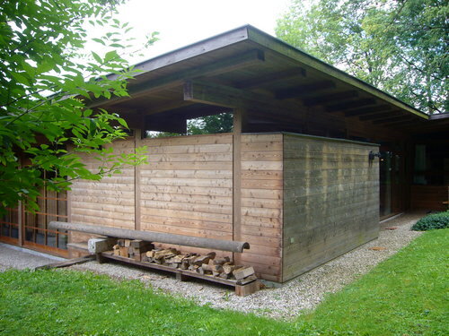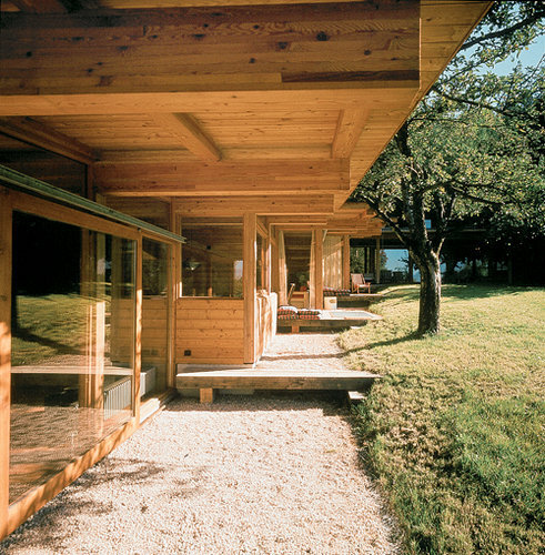 Der warme Farbton der Lärche war ein Grund für die Wahl dieses hochwertigen Baumaterials, eine farbliche Oberflächenbehandlung lehnte Garstenauer ab. Der Architekt hatte damals im Rahmen von Vorlesungen an der Universität Innsbruck grundsätzliche Aspekte zum Thema Behaglichkeit untersucht und »reale wie außerrationale Faktoren« für die »Unschlagbarkeit« von Holz gefunden: »Das Holz als Hauptbaustoff sorgt für „Kühle“ im Sommer und für „Wärme“ im Winter. Auch bei großer Kälte genügen 20 Grad mittlerer Raumtemperatur, da die relative Luftfeuchtigkeit nicht unter 40 Prozent sinkt. Höchste Behaglichkeit ist auf diese Weise gepaart mit geringstem Energieaufwand.« Die ursprünglich von einer Wärmepumpe versorgte Fußbodenheizung wird nur in Extremfällen von einigen Radiatoren unterstützt. Der mehrschichtige Aufbau der Decken- und Wandflächen und Dreifachverglasungen ermöglicht – so Garstenauer – einen U-Wert von 0,3W/m²K. Die Baukosten entsprachen den üblichen Kosten für Mauerwerksbauten.