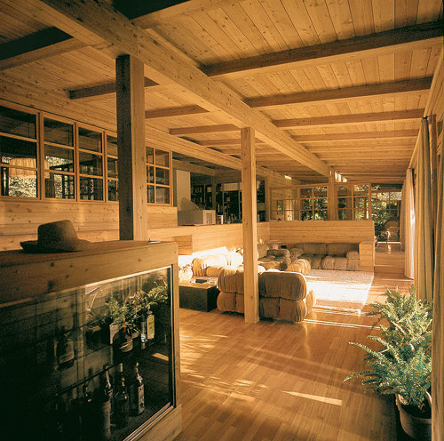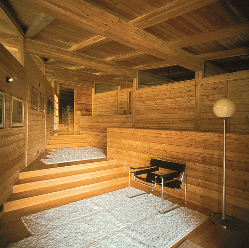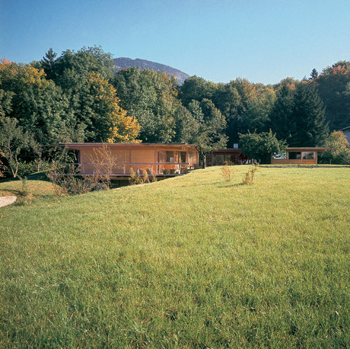 Das große, flache Pultdach entspricht dem leicht abfallenden Terrain. Da die einzelnen Räume bzw. Raumgruppen – durch einige Stufen getrennt – auf dem jeweiligen Hangniveau liegen, bleibt der Geländeverlauf im Haus spürbar. Der Landschaftsbezug – durch großzügige Verglasungen und Blickbeziehungen gegeben – verzahnt sich mit einer innenräumlich differenzierten Durchwegung. Garstenauer machte durch seine von Klarheit und behaglicher Atmosphäre geprägte Holzarchitektur die Natur »bewohnbar«, Landschaft, Jahreszeiten und Witterung in besonderer Unmittelbarkeit spürbar. Die sensible Einbindung in den Landschaftsraum trägt dazu bei, dass das Haus als Ganzes kaum sichtbar ist, umso mehr überrascht dann seine räumliche Weitläufigkeit.