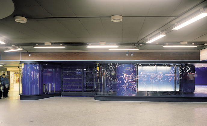 Diese innere Wolke besteht aus einer ETFE-Folie, die durch Überdruck ihre Form erhält und mit einem Befestigungspunkt von den Glasträgern der Decke hängt. Gegen eine Beschriftung mit den Namen der Opfer hatten sich einige Angehörige ausgesprochen. Stattdessen ist auf ihr eine Auswahl der Botschaften zu lesen, die Passanten in vielen Sprachen in den Tagen nach dem Attentat auf Zetteln oder den Bahnhofsmauern hinterlassen hatten. Von der in ihnen zum Ausdruck kommenden kollektiven Trauer und dem Entsetzen wird der Besucher umfangen, wenn er aus dem geschäftigen Treiben der Bahnhofspassage in den 500 Quadratmeter großen, intensiv blauen Gedenkraum tritt und unter dem Lichtkreis der gläsernen Säule steht. Zwei Luftschleusen, je eine als Ein- und eine als Ausgang, sorgen für den konstanten Überdruck in dem fast kapellenhaft anmutenden »Gewölbe«. Hinter der ersten Schleuse sind auf einer hinterleuchteten gläsernen Platte in der Wand die Namen der Opfer eingeschrieben – allerdings nicht aller. Zwei Familien haben die Nennung ihrer Angehörigen untersagt, wollten sich nicht an diesem Ort der öffentlichen Trauer wiederfinden.