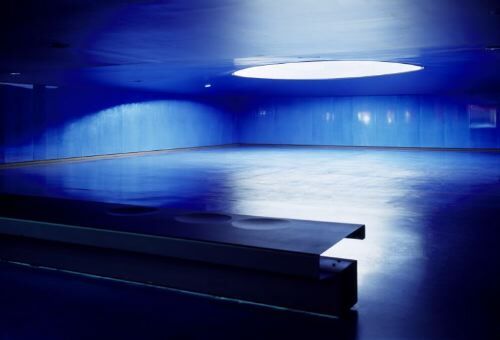 Eine Bank im Eingangsbereich stellt die einzige Möblierung des Raumes dar. Wandpaneele, Akrylharzboden mit eingelassenen Glassplittern und die sich zur Lichtsäule hin leicht wölbende Decke sind rundum im selben Blauton gehalten. So ist alle Aufmerksamkeit auf die je nach Jahres- und Tageszeit gleißend helle, graue oder angeleuchtete Säule fokussiert. Die Glasfassade zur Bahnhofspassage ist wie durch Druckwellen deformiert, was sowohl von außen als auch von innen zu verzerrt-verschliffenen Blicken führt. Damit soll, ¬einem Traumbild ähnlich, der Raum aus der Zeit gehoben werden.