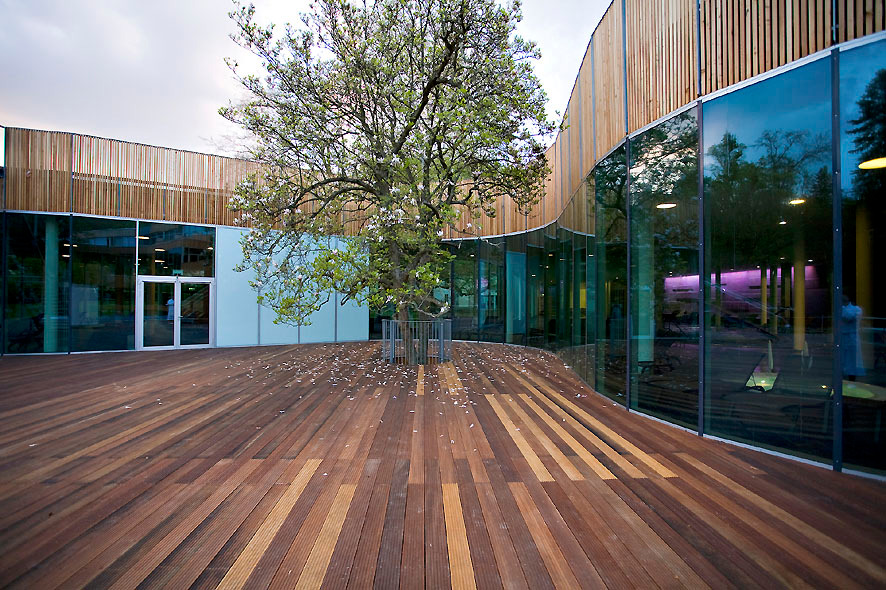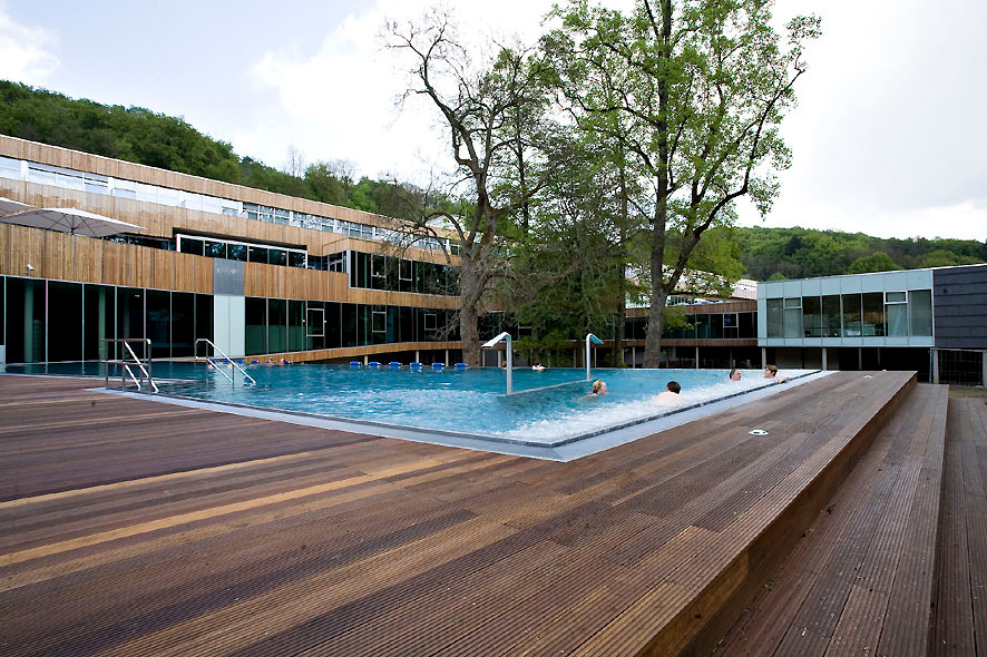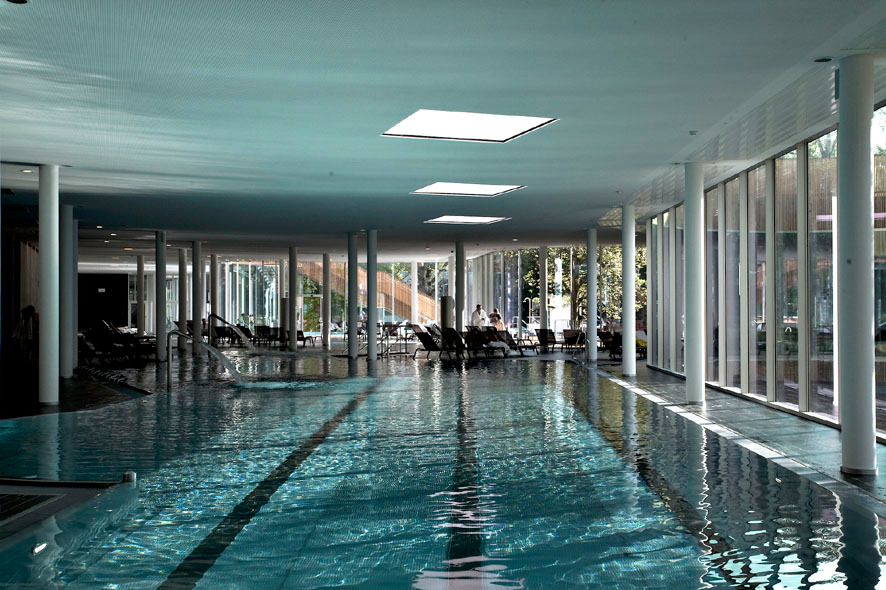 Während die 110 Hotelzimmer, die gas- tronomischen Einrichtungen und das Bad jeweils starken Bezug zum Außenraum haben, sind die therapeutischen Bereiche nach innen orientiert. Der Gast steht im Zentrum und soll sich auf sich und die Gesundheit seines Körpers konzentrieren können. Naturbezug gibt es dennoch auch dort in Hülle und Fülle. Die Wartebereiche liegen entlang großer, raumhoher Glasfronten mit Ausblick zu den internen Gärten und vermitteln das Gefühl, sich mitten im Park auf die Behandlungen einzustimmen.