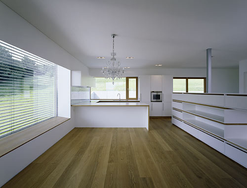 Durch ein Oberlicht dringt diffuses Tageslicht in den Raum. An einem weißen Schleiflackregal entgleitet die Treppe zur Terrasse. Eine Öffnung ist eingeschnitten: Man erahnt bereits den grünen Waldblick, den man vom Esstisch aus hat. Im Fensterpassepartout entfaltet er sodann seine volle Wirkung.
