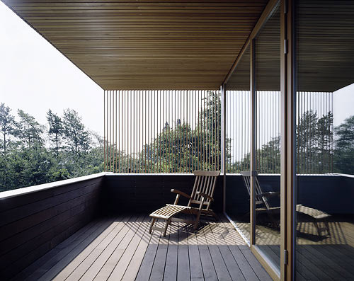 Der Bauherr schaut gern in die Bäume. Durch den Postkartenrahmen werden sie zu einem Bild gefasst, im Schlafzimmer fallen sie ihm sogar regelrecht ins Bett. Auf dem eingeschnittenen Balkon im Nordosten kann man zudem Frischluft und Morgensonne tanken. Seine Frau indes sitzt am liebsten in der tiefen Fensterlaibung im Nordwesten. Von hier schweift der Blick bis weit über die Donauauen hinaus.