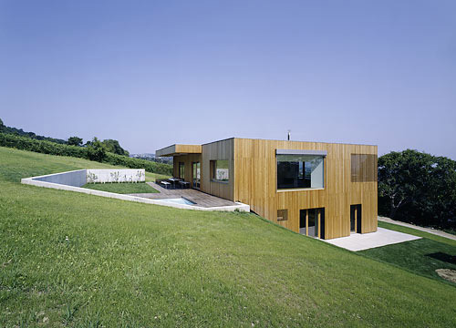Auch der Freiraum wurde in die architektonische Planung miteinbezogen. Das Wohnen geht auf einer Ebene in die Terrasse über. Sie wird von einer Stützmauer gefasst. Ein Pool und ein Stück Liegewiese sind in den Lattenrost eingelassen, als seitlicher Wind- und Sonnenschutz ergießt sich ein Holzschleier vom Vordach bis zum Boden.