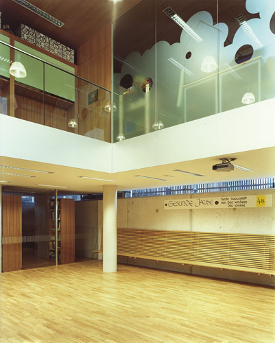 Das Haus ist im Westen durch eine verglaste Schleuse an den Altbau angekoppelt. Der alte Schuleingang wurde beibehalten. Auf dem Weg zum Neubau wird einem dann bewusst, wie sehr der Zahn der Zeit inzwischen am Bestand genagt hat. Privilegiert sind eindeutig die, die im Neubau untergebracht sind. Daran wird man in nächster Zukunft wohl auch etwas ändern müssen.