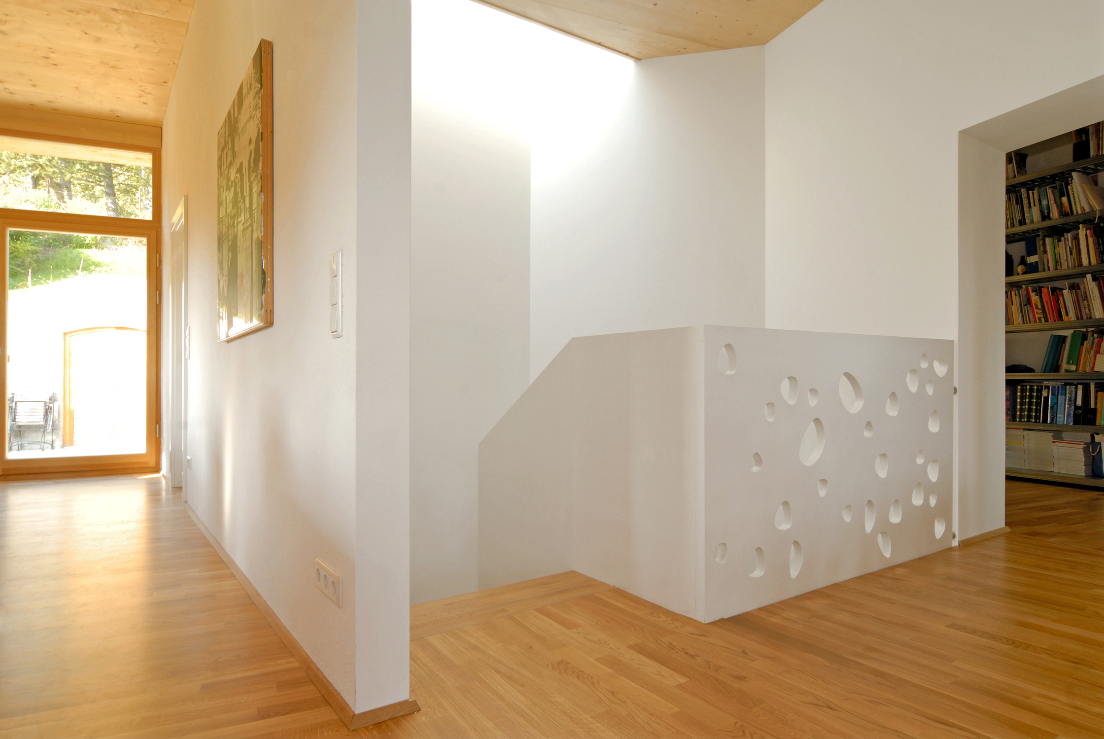 Schöne Lichtstimmung auch im Foyer: Durch einen fast haushohen Glasstreifen fallen Sonne, Himmel und Föhrenwipfel in den Raum. Wie eine Skulptur klettert die Treppe über die Garderobe und windet sich ums Atrium. „Das Licht von oben ist wunderbar“, schwärmt die Baufrau, „wenn es regnet, ist es besonders schön.“ Ein Hingucker ist jedenfalls die Brüstung im Stiegenhaus: Die massive Wand ist mit ovalen Löchern perforiert.