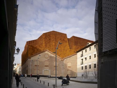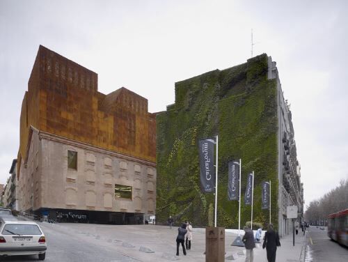Gegenüber des Königlichen Botanischen Gartens gelegen, ragt das Caixa Forum aus dem leicht ansteigenden Wohnviertel wie ein Gebirgsmassiv empor. Der neue Baukörper wurde auf die bestehende Ziegelfassade des Elektrizitätswerks aufgestockt, während man den Granitsockel des Altbaus abriss. Die hochgezogene Fassade versteht Jacques Herzog als «zerklüftete Landschaft», geprägt von Schrägen und Einbuchtungen. Dabei orientiert sich das Rot der gusseisernen Fassadenplatten an den Dachziegeln der angrenzenden Wohnbauten. Diese Platten gehören zur architektonischen Attraktion des Museums: Sie besitzen alle ein engmaschiges Perforationsraster, ausserdem unregelmässig geformte Einschnitte. Diese Module schirmen das aufgepfropfte Gehäuse wie eine Aussenhaut ab. Herzog & de Meuron interessieren sich seit mehreren Jahren für diese hybriden Konstruktionselemente, die sie wegen ihrer textilen und dekorativen Eigenschaften schätzen. Auch in der im Bau befindlichen «Ciudad del Flamenco» von Jérez de la Frontera kommen diese Elemente, die an die Fassadenstruktur der Moschee von Córdoba (784–987 n. Chr.) erinnern, zum Einsatz. Die «porösen» Platten des Caixa Forum funktionieren gleichzeitig als Fassade und Fensteröffnung: Sie schliessen ab, leiten aber zugleich gedämpftes Licht in die Museumsräume, in denen sie für ein angenehmes Clair-obscur sorgen.