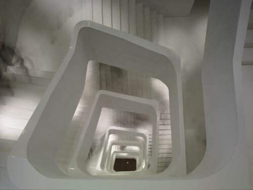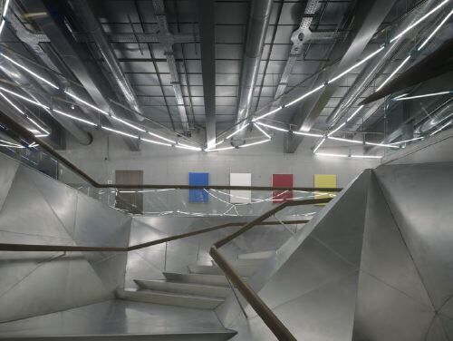 Auch konstruktionstechnisch hebt sich der hochkomplexe Baukörper von allen anderen Museumsprojekten auf dem Paseo del Arte deutlich ab (siehe «Dreibein, Korsett und Regenschirme», S. 24 ff.). Harry Gugger, Partner von Herzog & de Meuron, erklärte dazu: «Anfangs dachte niemand an die enormen Schwierigkeiten, die das Projekt mit sich brachte. Zunächst galt es, das Gebäude abzustützen, erst danach konnte der Granitsockel des Altbaus entfernt werden.» Das gesamte Gebäude lastet in den Untergeschossen auf drei mächtigen Pfeilern, die aus dem Fundament ragen. Doch davon bemerkt der Besucher nichts. Er nimmt nur den verkleideten Betonkern wahr, einen mächtigen Stängel, über dem sich das Gebäude wie ein Pilzdach wölbt. Dieser prismatisch geformte Eingangsbereich mit öffentlichem Platz unter dem schützenden Dach mutet wie expressionistische Filmarchitektur an. Die in den zwei Untergeschossen untergebrachten Säle, an deren Wände perforierte Aluminiumplatten angebracht wurden, sind allesamt stützenlos. Ebenso die Ausstellungssäle in der zweiten und dritten Etage. In den fünf oberen Geschossen, die sich über dem buchstäblich aufgelösten Sockelgeschoss erheben, demonstrieren die Basler, wie man Räume sinnlich gestaltet: Im Restaurant hängen tropfenförmige Lampen aus der Werkstatt von Herzog & de Meuron. Die Treppenhausspirale mit ihren elegant geschwungenen Ecken erstrahlt in blendendem Weiss. Und im Foyer überrascht der ruppige Charme eines von Neonröhren, Stahlboden und unverdeckten Ablüftungsrohren geprägten Industrie-Ambientes. Das Direktorenzimmer mag zunächst klaustrophobische Ängste wecken, bis man die Fensterschlitze unterhalb der Decke entdeckt.
