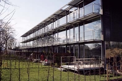 Doch das ist nur die dauerhafte Hülle, sozusagen die Hardware. Innen ist der filigrane Quader so offen und großzügig bespielbar, wie es bei vier Meter fünfundachtzig Achsmaß und gut elf Metern Tiefe nur möglich sein kann. Zwischen den Schotten aus Beton bestehen die Wohneinheiten aus einem Holz-Stahlskelett, das den Grundriss quer in eine schmale Erschließungs- und eine Wohnzone, längs in drei gleich große Zonen teilt. So entstehen in den Obergeschossen gut nutzbare 16 Quadratmeter-Zimmer. Die Crux der reinen Nordorientierung wird durch Oberlichter, Innenverglasungen und große Fenstertüren wenn auch nicht gelöst, so doch abgemildert. Dafür öffnen sich die Solarreihenhäuser voll verglast zur Südsonne. Den acht Zentimeter dünnen, teils modular demontierbaren Brettschichtholzdecken fehlt indes die Speichermasse, um passive Gewinne effektiv zu speichern (Peter: »Wir sind keine Technik-Freaks.«). Ein – einheitlicher – Sonnenschutz vor der Fassade war nötig und eine leistungsfähige Lüftungsanlage mit Wärmerückgewinnung: Alle Leitungen sind selbstbewusst in einem frei im Raum stehenden, 45 cm mächtigen Wickelfalzrohr untergebracht. Mit (meist großzügig rahmenloser) Dreischeibenverglasung, dachintegrierter Vakuumröhrensolaranlage und zentraler Pelletsheizung erfüllt das Gebäude den KfW40-Standard. Auf baubiologische Ausführung wurde Wert gelegt. Ob die Ökobilanz Alu-Lamellen rechtfertigt, sei dahingestellt – beim Nachfolgeprojekt in Neu-Riem verwenden die Architekten ein Schuppenkleid aus Schiefer. Die rationelle Konstruktion glich jedenfalls die extrem hohen Grundstückskosten in diesem frei finanzierten Teil des Entwicklungsgebietes etwas aus.