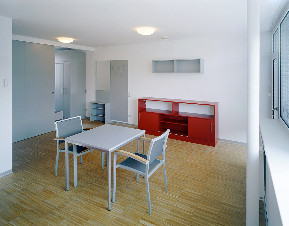 Alle Einheiten sind nach Süden und Westen ausgerichtet und machen das Beste aus ihren knapp 20 Quadratmetern. Jede Mini-Wohnung hat Nasszelle, Eichenparkett, eine Kochzeile mit Essplatz und ein raumhohes Fenster. „Wir wollten den Kontakt nach außen verstärken“, so Langer, „man kann sich in die Fensternischen setzen und an der Straße entlang schauen.“ Noch deutlicher sagen es die Bewohner: „Das ist unser Haus. Wir haben ein echtes Wir-Gefühl.“