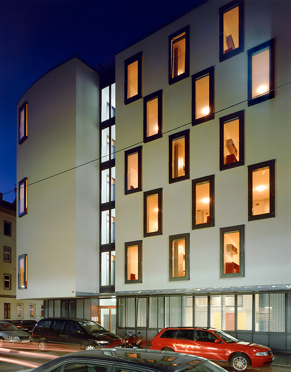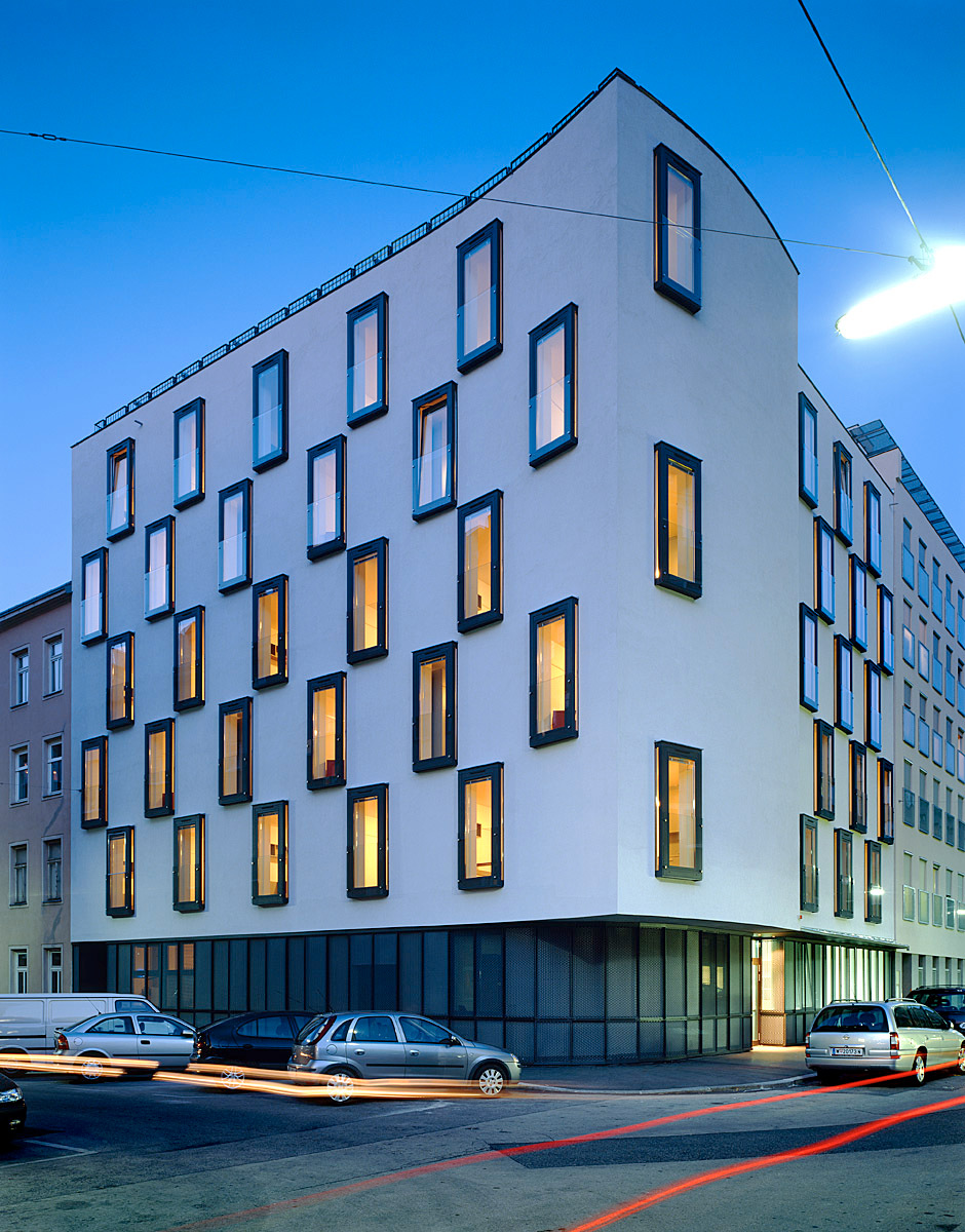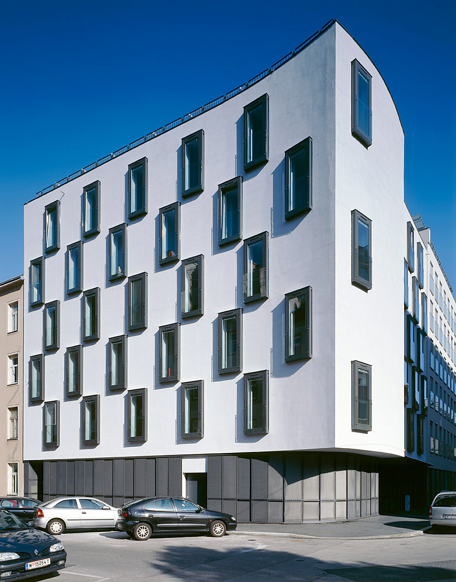 Wien Favoriten: Rundum Lochfassaden, im Westen ein Gründerzeitblock, im Süden ein Wohnbau mit Geschäft und nebenan ein kleiner Park. Mit einem kecken Dreh schwingt sich der elegante Neubau über seinem metallenen Sockel ums Eck, ebenso schwungvoll wird die Lochfassade variiert. Vorwitzig tanzen leicht vorstehende französische Fenster in dunklen Metallrahmen über die weiß verputzten Wände.