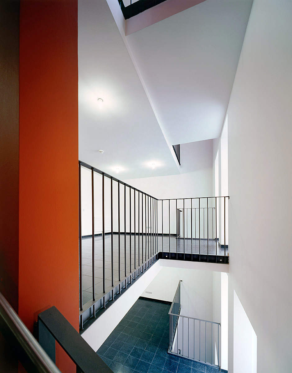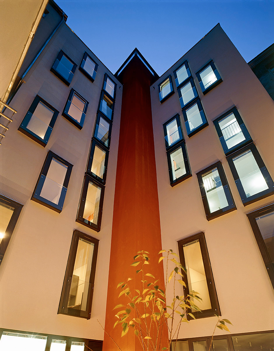 Wie ein innerer Hauptplatz breitet sich vor der Stiege ein großzügiges Foyer aus. Rot setzt im ganzen Haus vitale Akzente, beispielsweise im Stiegenhaus und an den Möbeln. „Was braucht es, um menschenwürdig zu leben?“, bringt Architekt Langer die Aufgabe auf den Punkt. „Uns war wichtig, dass jeder seine eigenen vier Wände hat und die Tür zusperren kann.“