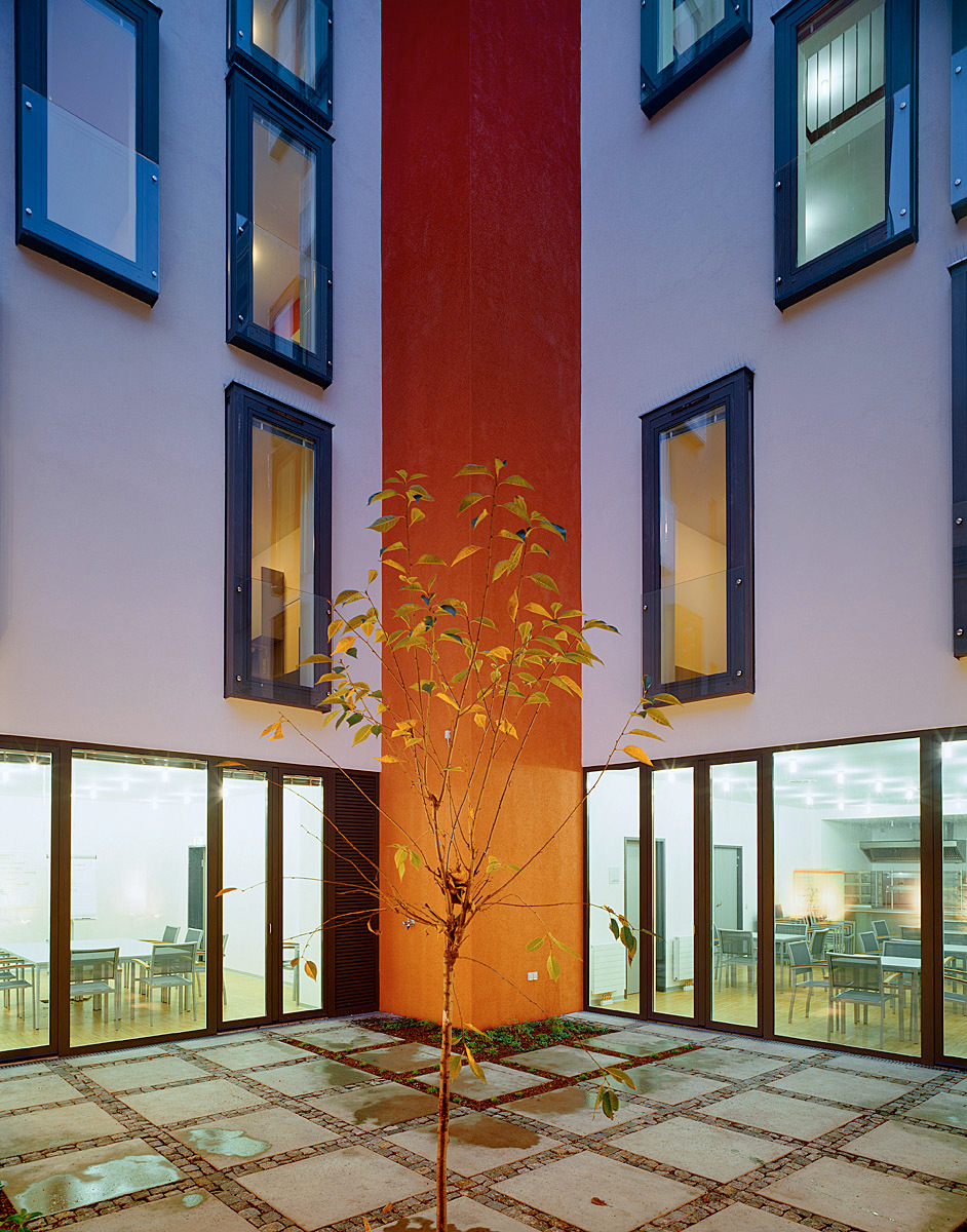 Kostendruck und Raumbedarf waren sehr hoch. Um die Räume im Untergeschoß vollwertig nutzbar zu machen, wurde im Keller ein Atrium eingeschnitten. An der Glasfassade zum Hof liegt die Kantine, wo man günstig essen kann. Viele treffen sich da, spielen Karten und trinken Kaffee. „Mir gefällt es hier ausgezeichnet. Ich bin froh, dass ich nun meine Ruhe habe“, sagt Kurt aus dem dritten Stock.
