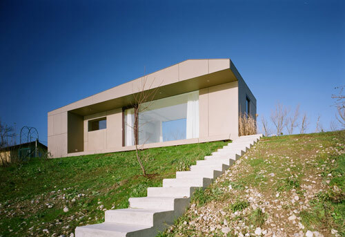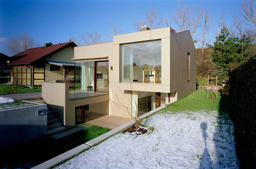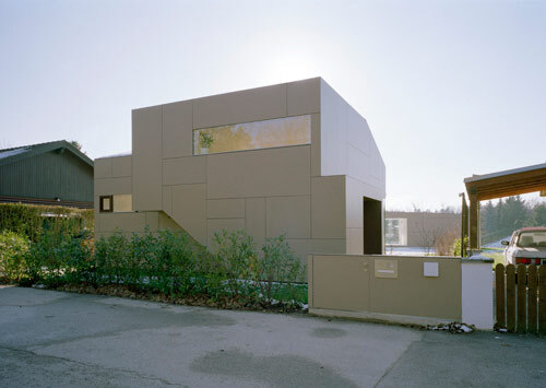 Mit 13 Meter Breite und 27 Meter Länge ist der Grund sehr klein. An einer steilen Böschung ruht dahinter - tief unten im Süden - der See. Die Bauflucht des Hauses musste sich nach den Nachbarn an der Straße richten, mehr als 45 Quadratmeter Grundfläche waren nicht drin. Außerdem war ein flaches Satteldach in Grau oder Braun gefordert. So kam das kleine, kompakte Haus zu seinem beigen Eternitplattenkleid, das es vom Scheitel bis zur Sohle in einen feinen Materialguss taucht.