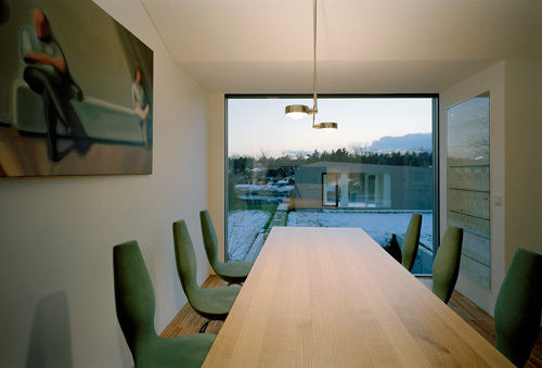 Fünf Stufen höher entschwebt der Essplatz im Sonnenerker scheinbar ins Freie. Doppelt gebrochen sieht man durch die Glasscheiben des Nebengebäudes auf den See. „Andere Leute haben eine Fototapete, doch hier ist alles echt“, schwärmt die Baufrau, „am meisten genieße ich es, mitten in der Natur zu sein. Ich muss nicht hinaus - ich hab sie im Haus.“