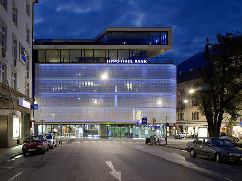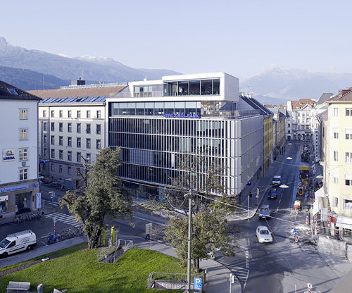 In Innsbruck stand an dieser Ecke die alte Hypo-Zentrale. Ein Gründerzeitbau, der infolge eines Bombenschadens mehrfach umgebaut wurde – zuletzt von Horst Parsson. Es war keineswegs ein schlechtes Haus. Es hatte nur einen Nachteil: Es war nicht behindertengerecht. Und dieser Nachteil konnte nicht korrigiert werden, weil der sehr massive Tresorraum, auf dem das Haus teilweise stand, über das Erdgeschoßniveau hinausragte. Um einzutreten, musste man mehrere Stufen überwinden.
