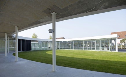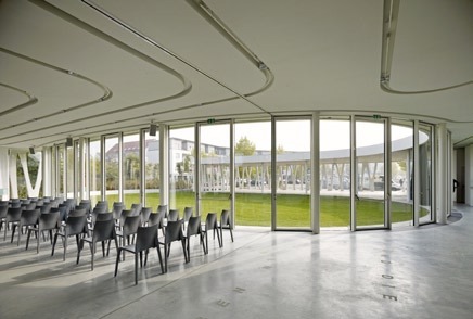 Surrounded by a row of upright supports that recall plants, the community centre attracts passers-by, offering views of the interior and what lies beyond. It is set around a semi-public garden courtyard; rather than shutting itself off from its mundane surroundings, the structure of meeting hall, meeting rooms and youth centre seeks contact. The eye-catching, load-bearing outer shell consists of two basic modules: prefabricated unclad concrete components that could be installed either way up, and an all-round glass facade. The perfectly moulded concrete parts with their sophisticated geometry called for experienced and extraordinarily precise production, supplied by a manufacturer located some 200 km away.