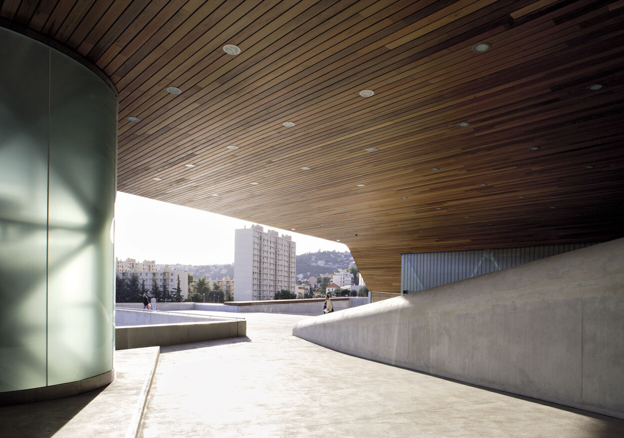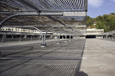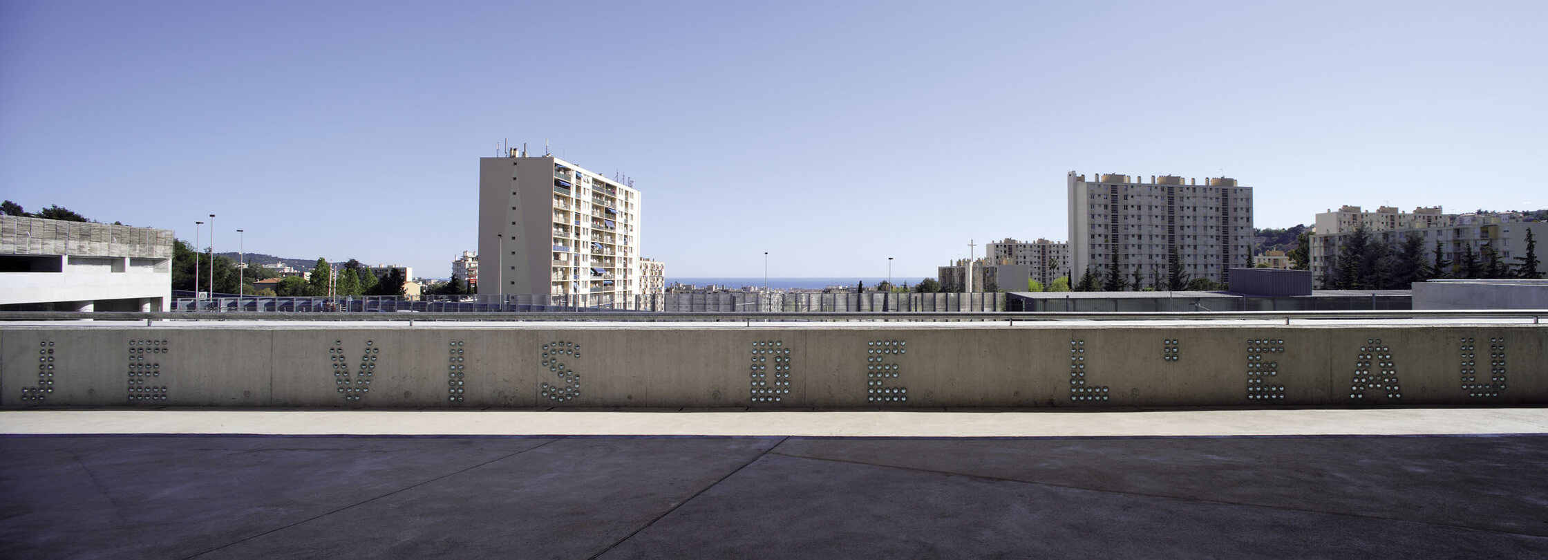 - Terrasse oberhalb der Endhaltestelle „Las Planas“ mit der künstlerischen Arbeit „Je vis de l’eau elle s’écoule“ von Emmanuel Saulnier.