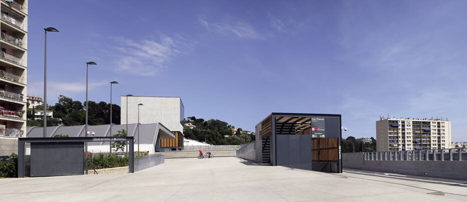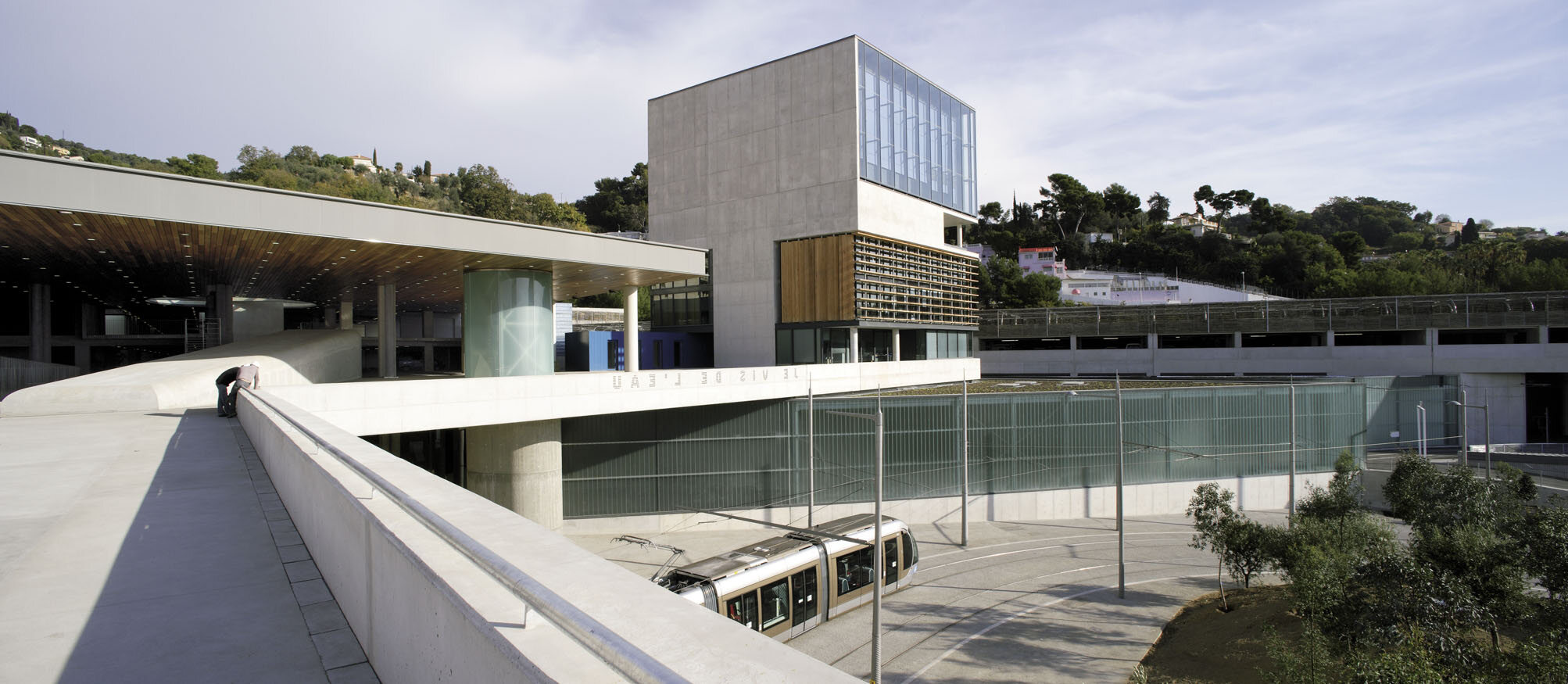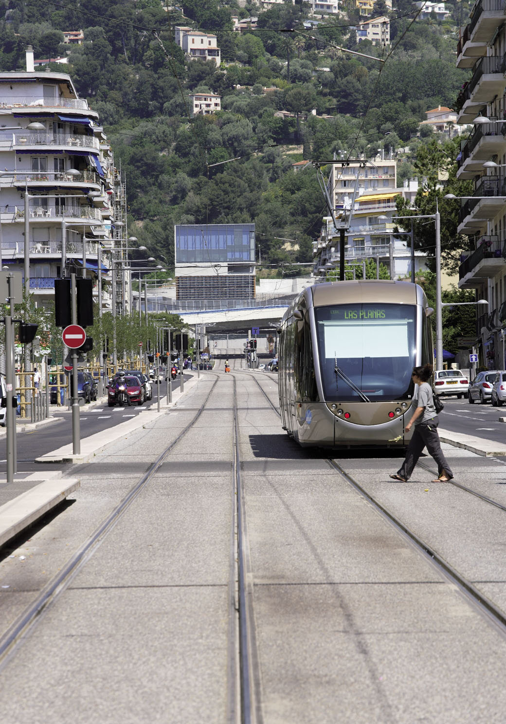 - Durch die Straßenbahn sind der Boulevard Comte de Falicon und der Boulevard de Gorbella mit dem Auto nur noch reduziert befahrbar. Im Hintergrund sieht man die Brücke der Autobahnausfahrt, die Leitzentrale und den Berg Falicon. Die Kosten für die Endhaltestelle mit Depot und Werkstatt beliefen sich am Ende auf 75 Millionen Euro.