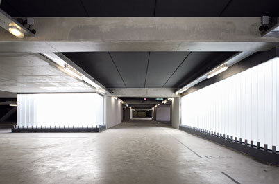 - Die Parkplätze verfügen über Lichtschächte, die bis zur Werkstatt hinunterführen.