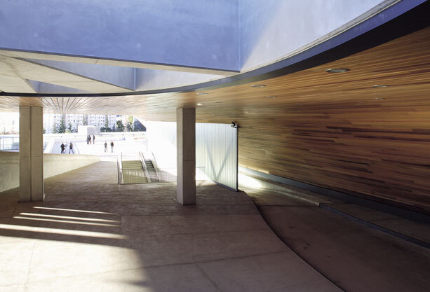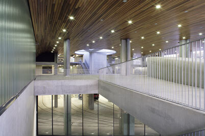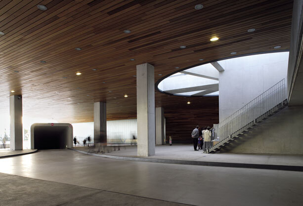 - Der Parkhausautomat befindet sich unter einer runden Lichtöffnung. Die Umsteiger vom Auto auf die Tram durchqueren weitgehend offene und großzügig bemessene Räume.