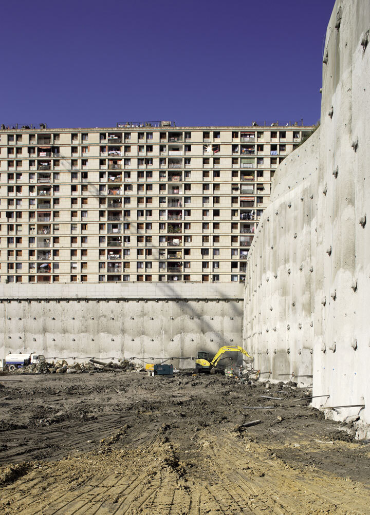 - Baustellenfoto nach dem Aushub. Das Wohnviertel mit den 12-geschossigen Gebäudescheiben und Türmen erfährt mit der neuen Tram eine deutliche Aufwertung. Zurzeit werden die Fassaden saniert.