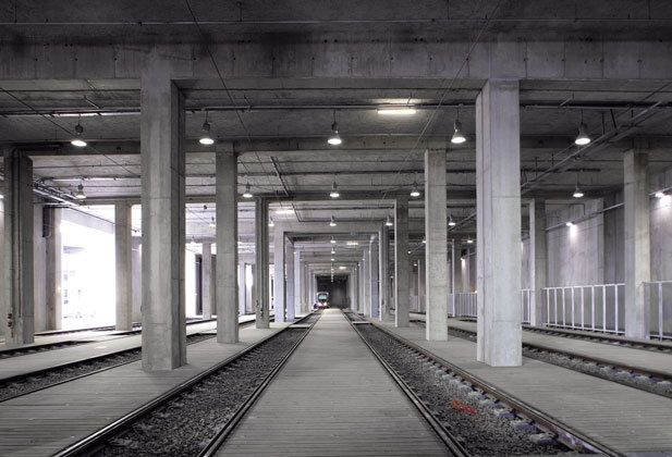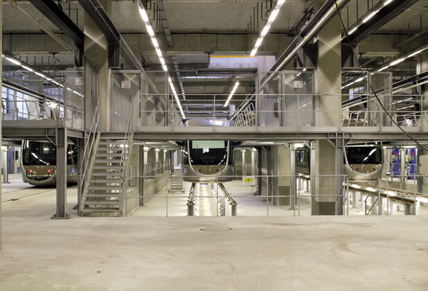 - Die Werkstatt erhält durch Schächte in der Decke etwas natürliches Licht. Das Depot liegt teilweise im Felsen. Fürdie gesamte Endhaltestelle mussten über 200.000 m³ Erdreich und Felsgestein bewegt werden.