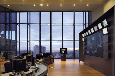 - Die Halle der Leitzentrale für die Straßenbahn und Busse mit zweigeschossigem Schaufenster zur Stadt. Auf der elektronischen Tafel rechts erscheint die Tramlinie 1.