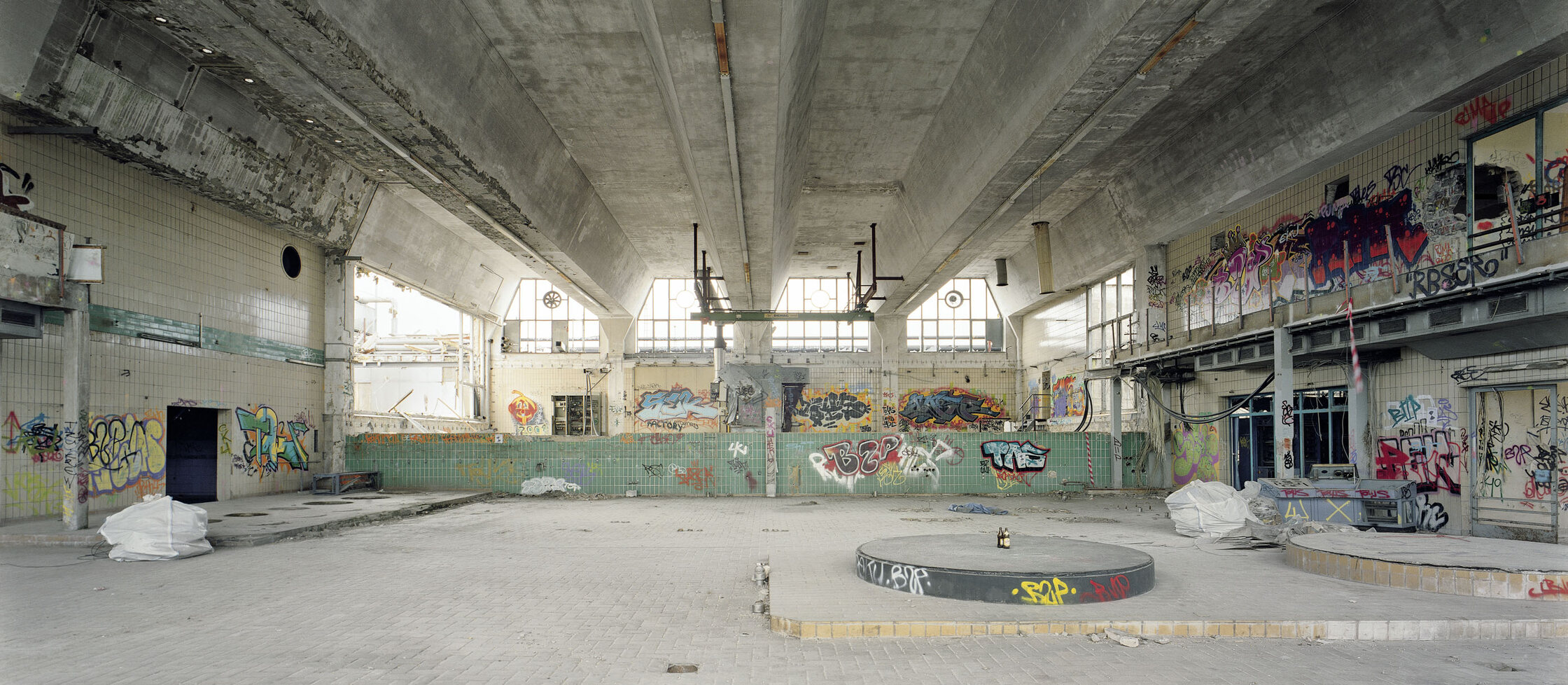 - Der Hauptbetriebsraum im Nürnberger Milchhof kurz vor dem Abriss. Raumbestimmend war das gefaltete Betondach, das sich außen als gestaltgebende Silhouette des lang gestreckten Gebäudes abzeichnete.