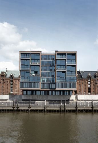 Von einem weiteren Newcomer, nämlich spine architects, stammt das exklusive »La Taille Vent«: ein kompakter Solitär, der durch seine Hard-Edge-Architektur im Stil der siebziger Jahre mit braunen Fensterbändern und einer kantigen Kalksteinverkleidung auffällt. Überraschend konventionell, obgleich sehr kultiviert, präsentieren sich hier die Grundrisse: Großzügige und gleichwertige Räume, die sich an langen Korridoren reihen (was an die in Hamburg so beliebten bürgerlichen Wohnungen aus der Kaiserzeit erinnert und räumliche Qualitäten ins Spiel bringt, die in der HafenCity nicht selbstverständlich sind). Der eigentliche Clou ist jedoch die Einschnürung des Baukörpers – die Taille –, die den Vorteil bietet, dass man auch von den rückwärtigen Balkons aus das Hafenpanorama genießen kann. Außerdem war es durch diesen Einschnitt problemlos möglich, die unteren Geschosse in jeweils vier, die oberen dagegen in jeweils zwei Wohnungen aufzuteilen.