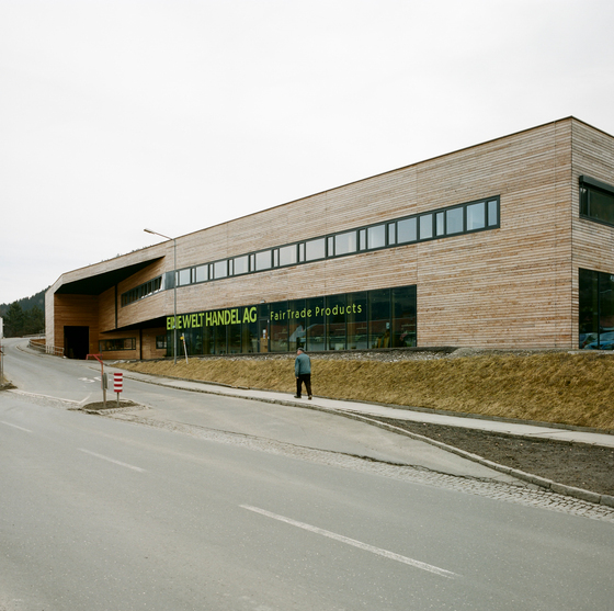 Die anthrazitfarbene, glatt geschliffene Putzfassade des auf der Ostseite der Halle angefügten Verwaltungstraktes hebt sich klar ab. Sie greift zwar das Anthrazit der Fassadenprofile und Tore sowie in den Fensterlaibungen das Material Blech wieder auf. Doch die Höhenstaffelung der Lochfassade scheint nicht mit der Halle zu korrespondieren. Insbesondere die Fensterbrüstungen nehmen keine erkennbaren Bezüge zur vertikalen Gliederung der Lagerhalle auf. Unter funktionalen Gesichtspunkten hingegen sind Halle und Verwaltungstrakt sehr gut aufeinander bezogen. Die Architekten setzen hier das Konzept der kurzen Wege bei geringem Flächenverbrauch konsequent um. Der viergeschossige Bürotrakt spannt sich als Torhaus über den abgesenkten Ladehof und schafft auf diese Weise einen geschützten Vorbereich für die Anlieferung. Die Waren werden hier entweder zwischengelagert oder direkt über die Tore auf der gegenüberliegenden Seite auf dem Messegelände verteilt.