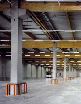 Halle und Verwaltungsgebäude wurden als Betonfertigteilkonstruktion ausgeführt. Für das Hallentragwerk entwickelten die Architekten jedoch eine Konstruktion aus Holz, die das Gewicht des Daches möglichst gering hält und somit schlanke Betonstützen ermöglicht. Die 21 Meter weit spannenden und zwei Meter hohen Brettschichtleimbinder mit Holzpfetten stehen zudem in einem spannungsvollen Kontrast zum spröden Charme der Betonoberflächen, die im weiträumigen Halleninnenraum vorherrschen. Mit dieser Konstruktion überzeugten die Architekten ihren Auftraggeber, den engen Zeit- und Kostenrahmen einhalten zu können, was ihnen neben dem Entwurfsauftrag auch die Übertragung aller weiteren Leistungsphasen einbrachte.