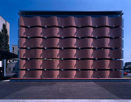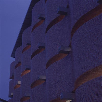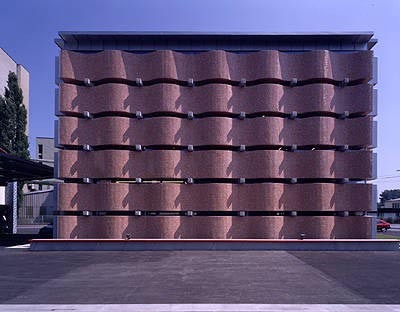 Die Wellenfassade mit den roten Glasmosaiksteinen erinnert auf Fotos an ein Parkhaus, nur ist das Gebäude in natura dafür viel zu klein. Die Fensterschlitze orientieren sich nicht an der Geschoß-, sondern an der Augenhöhe auf dem Eingangsniveau. Aber niemand wird aus dem Bau herausschauen, werden die Blicke doch durch verspringende Ebenen im Innern in den Raum hineingezogen.