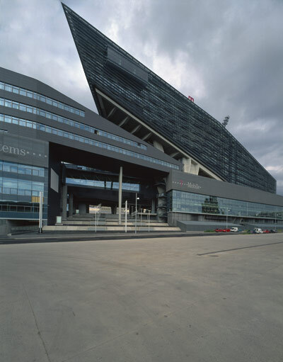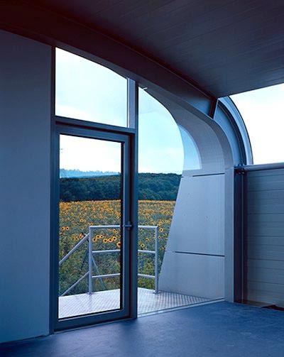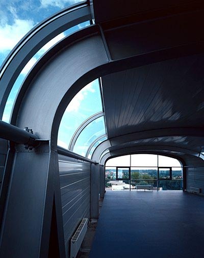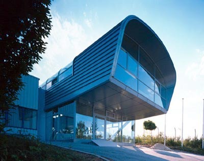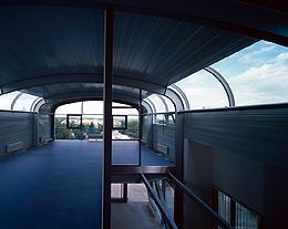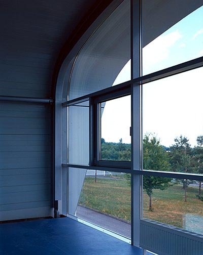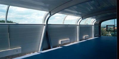 Auch die Treppe von der ebenen Erde hinauf ins Obergeschoß, frei in den Raum hineingestellt, ist angewandte Gegenwart: vergleichbar einer Flugzeug-Reling. Im übrigen: taubenblaues Linoleum auf dem Boden im Innenraum, eine Gebäudehaut aus wärmegedämmten Blechkassetten mit einem darüberliegenden Gleitbügelsystem und die Untersichten der auskragenden Gebäudeschale aus Alucobond. Letzteres ist als Material äußerst vielversprechend. Es besteht außen und innen jeweils aus einer Aluminiumschicht und dazwischen aus einer gummiartigen Einlage. Sie ist hart, aber auch elastisch. Und wenn man eine Aluminiumschicht einschneidet, dann läßt sich dieses Material knickfrei und beliebig biegen. Der Unterschied zum Biegeverfahren der Alu-Bleche, die Johannes Gesteu bei der U 6 eingesetzt hat: Dort entsteht eine starke Ornamentik, die einen eigenen Aussagewert darstellt, bei Gerner und Gerner werden die Möglichkeiten des Materials anders genutzt. Ohne Ornamentik, glatt, zweckorientiert.