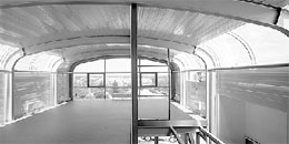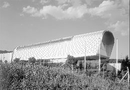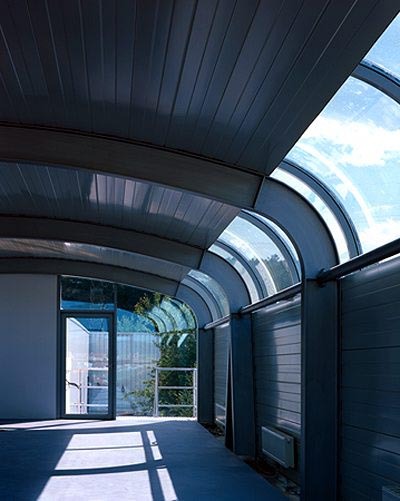 Konstruktiv präsentiert sich dieser bauliche Tatbestand extrem einfach, das heißt - er ist intelligent. Wenn vier gebogene Stahlrahmen genügen, von denen nur einer als A-förmiger Bock für die notwendige Aussteifung sorgt, dann ist das wohl genug. Darin liegt ja der Wert dieser Bauweise, daß sie vorgefertigt und materialminimiert vonstatten gehen kann.