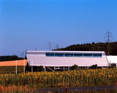 Aber davon sind wir noch weit entfernt. Einlösen lassen sich solche Erwartungen einstweilen vorwiegend im „privaten“ Auftragsbereich. Und da in den seltensten Fällen im großen, weil hier einfach die Betonlobby dominiert. Wirklich schöner, ausgefeilter Stahlbau in Verbindung mit einer industriellen Gebäudehaut und einer räumlichen Lösung, die mehr leistet als bloß Durchschnitt, ist hierzulande immer noch den Kleininitiativen vorbehalten. Gerner und Gerner haben ihren silbrig und gläsern schimmernden Schnellzugwaggon an einen ganz gewöhnlichen Industriebau angedockt. Und nicht einmal was seine Positionierung angeht, hatten sie großen Spielraum: Irgendwo zwischen vorgegebenem Abstand zum Nachbarn und der Pragmatik des notwendigen Andockens an einen vorhandenen Bau waren die Grenzen des „städtebaulichen“ Spielraums gezogen. Trotzdem ist das Gebäude so hervorragend plaziert, daß sich der Chef des Unternehmens am Ende nicht dazu aufraffen konnte, den ungemein attraktiven Raum im Obergeschoß, der als Großraumbüro für die Techniker geplant war, zu opfern. Er richtet sich jetzt selbst dort ein.