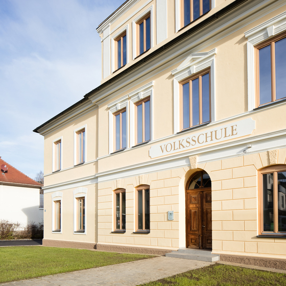 Die Mittelpunktschule Obermarch wurde von mehreren Gemeinden als gemeinsames Schulzentrum erstellt. Sie befindet sich am landschaftlich und städtebaulich wenig definierten Dorfrand von Buttikon. Die Absicht der Projektverfasser Niklaus Graber und Christoph Steiger lag darin, den Ort durch die Setzung dreier wohlproportionierter Volumen für Schulhaus, Dreifachturnhalle und Velounterstand in der Umgebung zu verankern. Die Bauten markieren die Ränder eines grossen Rechtecks, wobei die Zwischenräume den Pausenplatz bilden. Dieser wurde in Zusammenarbeit mit dem Luzerner Landschaftsarchitekten Stefan Koepfli mit Bändern aus Holzrosten gegliedert, wie sie im einst sumpfigen Gelände der Linthebene traditionell Anwendung finden. Sitzelemente als Ausstülpungen der Bodenbänder führen die spannungsreiche Anordnung von Körpern in der Fläche spielerisch weiter. Durch diese Betonung der Horizontalen kann der Geländesprung zwischen dem Pausenplatz und den tiefer liegenden Aussensportanlagen hinter der Turnhalle in Form einer monumentalen Aussentreppe wirkungsvoll inszeniert werden. Als Vermittler zwischen den Grossbauten und dem menschlichen Massstab wird ein kleinteiliger Fassadenklinker eingesetzt, der mit seiner konstruktiven Logik einen wohltuenden Gegenpol zum abstrakt-geometrischen Volumenspiel bildet.