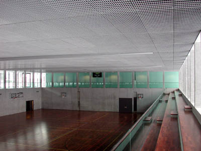 Der Bauplatz befindet sich neben einem Schulhausbau in einem locker bebauten, kleinteiligen Wohnquartier der fünfziger Jahre. Hier galt es, sich in die Atmosphäre der Ortes einzufühlen und gleichzeitig mit einem eigenständigen Baukörper der beliebig anmutenden Bebauung einen neuen Angelpunkt zu verleihen. Prägnanz und Filigranität wurden durch einen Stahlbau erreicht, bei dem entlang eines mittleren Erschliessungskorridors Stahlträger aus dem Boden wachsen und sich L-förmig nach aussen strecken. Bei der Turnhalle sind sie besonders hoch, im Bereich der Garderoben und Nebenräume nur eingeschossig. Die freien Aussenfassaden, die statisch bedingt durch minimale Pendelstützen gegliedert werden, sind verglast oder mit Holzelementen ausgefacht. Diese raumbegrenzenden Elemente sind unter die Stahlträger zurückversetzt, so dass grosszügige Vordächer entstehen, die dem Gebäude Leichtigkeit und Transparenz verleihen. Die Architektur erscheint durch die konstruktive Logik generiert und ordnet mit klarer räumlicher Ausrichtung die Aussenräume neu.