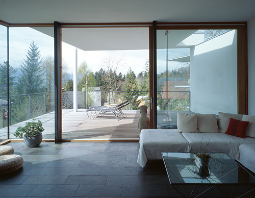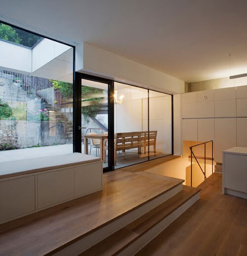 Die Schräge teilt den Raum in die oben liegende Küche mit angrenzendem Essbereich und in den unten situierten Wohnbereich, in den die sechsjährige Tochter des Hauses bis dato noch nie über die Stufen gelangt sein soll. Sie nutzt die Schräge als Rutsche. Trotz der Größe des Wohnzimmers und trotz der raumhohen, nahtlosen Verglasung mit Schiebetüren nach außen fühlt man sich im Herzstück des Hauses niemals verloren.