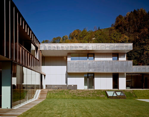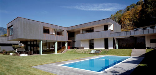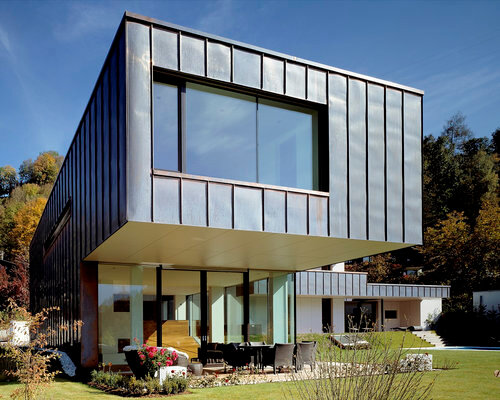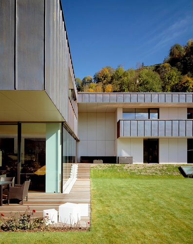 Nach außen hin verschlossen wie eine Festung, nach innen offen wie ein Glaspalast. Architekt Thomas Lechner schuf ein Haus im Kupferkleid, das sich perfekt ins Ortsbild und ins Gelände fügt.