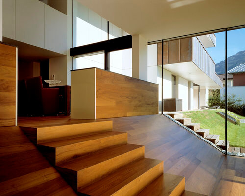 Den Wunsch des Bauherrn nach einem Domizil mit größtmöglicher Flexibilität erfüllten die Architekten durch die Wahl der L-förmigen Grundrisses. Dem Begehr nach einem Bezug zwischen Innen- und Außenraum wurde mit viel Glas und einem spielerischen Umgang mit dem Gelände Rechnung getragen: „Wir haben die abgeschrägte Fläche einfach ins Haus gezogen“, erklärt Lechner das Konzept.