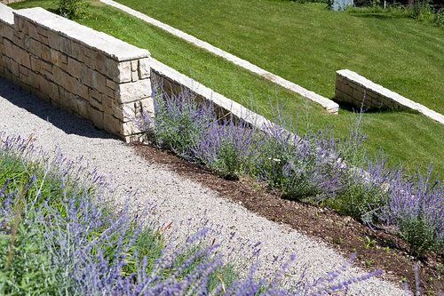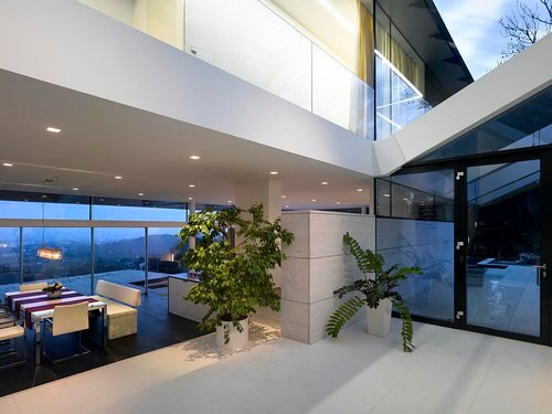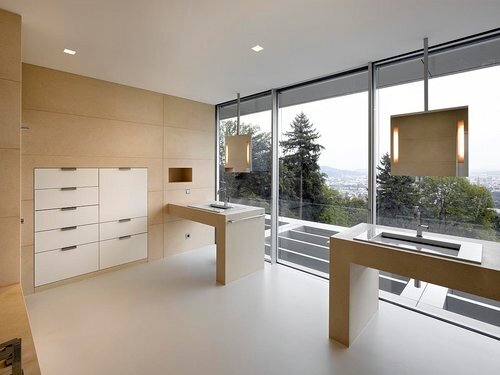Die großzügige Verglasung, das Vordach und die öffenbaren Elemente funktionieren als Filter zwischen Innen und Außen und schaffen einen fließenden Übergang zur Natur. Die Schlafräume und das Badezimmer befinden sich im Obergeschoß, das über eine Treppe, die zu einer offenen Galerie führt, erschlossen wird. Von der Garage kann man das Wohnhaus durch einen zweiten Eingang im Untergeschoß betreten. Dort befinden sich Büro, Hobbyraum, Atelier und die Versorgungsräume. Durch die Hanglage der Villa gibt es einen direkten Zugang zum Garten. Die Gartenmauern entwickeln sich zur Fassade, wodurch die Landschaft und das Gebäude ineinander greifen.