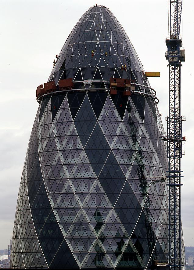 Diskret wird der im Rohbau bereits vollendete Swiss Re Tower von den Londonern «The Gherkin», die Essiggurke, genannt, auch wenn der Turm mit seinen diagonalen Fensterbändern eher einem Tannzapfen gleicht. Seine geschmeidige Erscheinung, in welcher die heute gerne gegeneinander ausgespielten organischen und geometrischen Formen überzeugend zusammenfinden, verleiht der harten Skyline etwas Humanes. Gegenüber der leicht geblähten Körpermitte ein wenig eingezogen, macht der kreisrunde Grundriss aus dem Turmbau einen skulpturalen Solitär, der sich gut in die vertikale Stadtlandschaft eingliedert und auf Fussgängerebene einen in der dicht bebauten City höchst erwünschten Platzraum mit vielen Durchblicken schafft. Den Angestellten soll dereinst der nach neusten ökologischen Erkenntnissen errichtete Bau helle Büros und Grossräume mit Ausblicken auf die Stadt und quer durchs Haus bieten; und wo man jetzt in schwindelerregender Höhe noch Wind und Wetter ausgesetzt ist, wird in einem halben Jahr unter einer gläsernen Kuppe ein leider nicht öffentlich zugängliches Aussichtsrestaurant entstehen. Nach seinem vielgerühmten Hongkonger Bankenturm von 1986 beweist hier Foster erneut, dass auch im Hochhausbau, der sich allzu oft im Zusammenspiel von Ingenieurtechnik und Fassadendesign erschöpft, städtebaulicher und baukünstlerischer Mehrwert geschaffen werden kann.