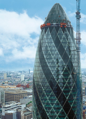 Mit dem 180 Meter hohen, formal zwischen Tannzapfen und Ananas oszillierenden Swiss Re Tower in London ist es Norman Foster gelungen, die modische Blob-Architektur geometrisch zu zähmen. Städtebaulich von Bedeutung ist zudem, dass der perfekt proportionierte Wolkenkratzer harmonisierend auf die Skyline der City einwirkt.